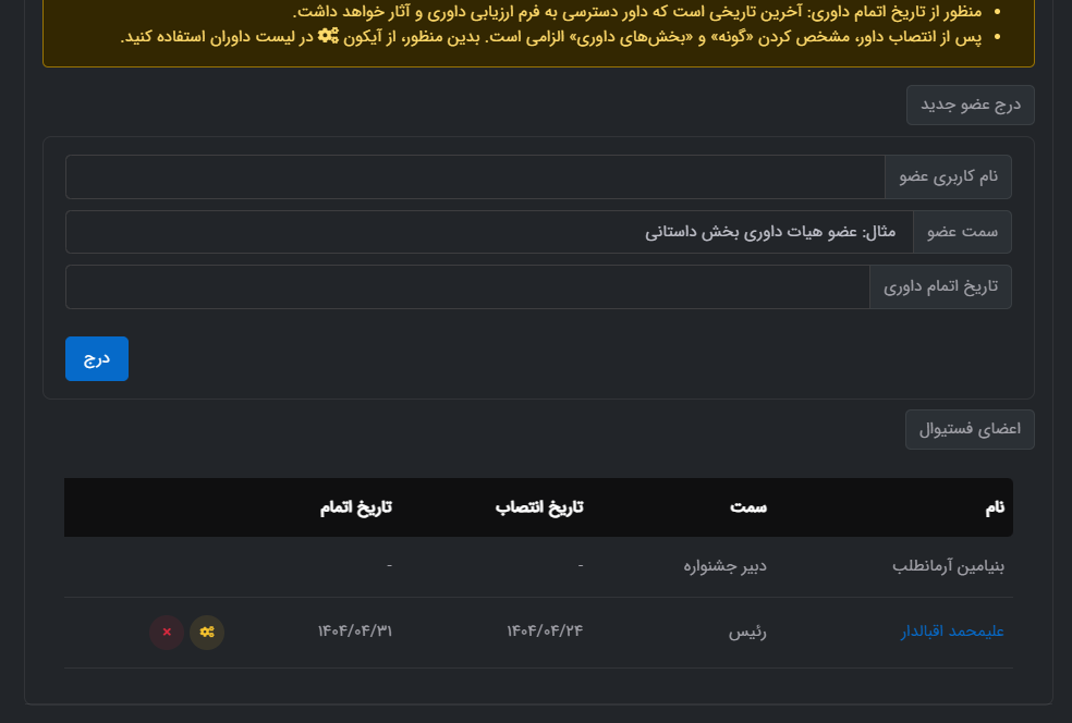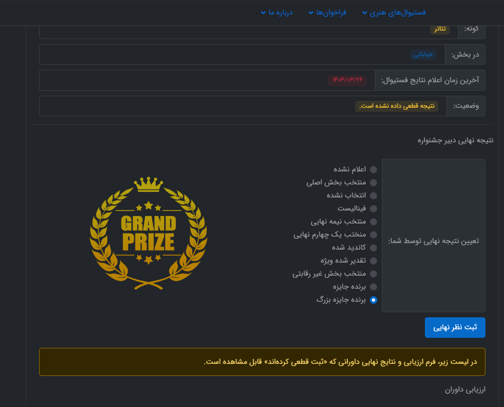 جهت راه اندازی یک جشنواره، نیاز به پذیرش آثار بصورت منظم، دسته بندی، زمان بندی، داوری و اعلام نتایج استاندارد وجود دارد.