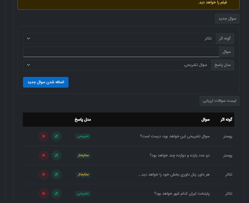 معیار سنجش و فرم های ارزیابی قابلیت پیاده سازی اختصاصی خواهد داشت و دبیر جشنواره میتواند سوالات چند گزینه و یا تشریحی خاص را ایجاد کند