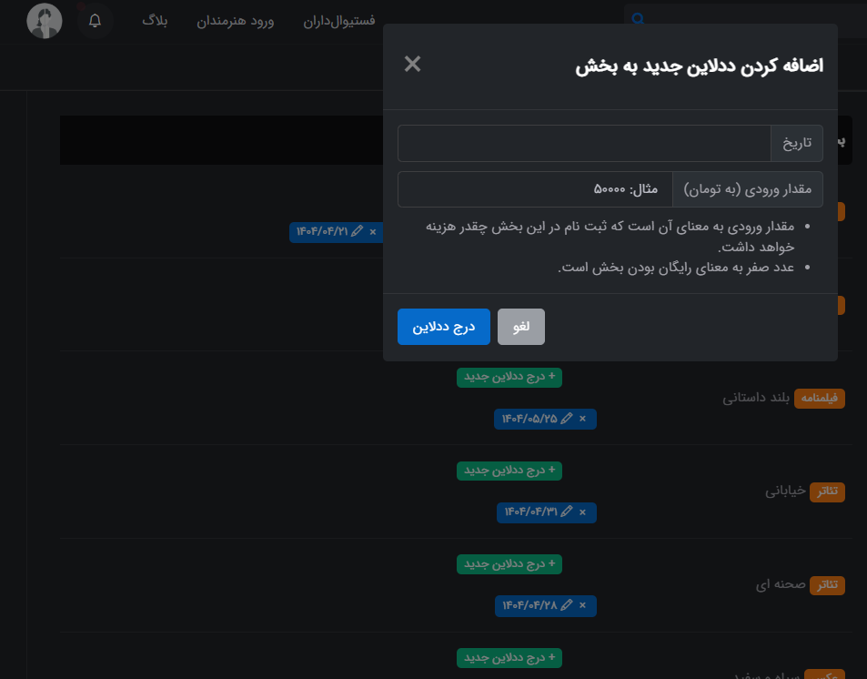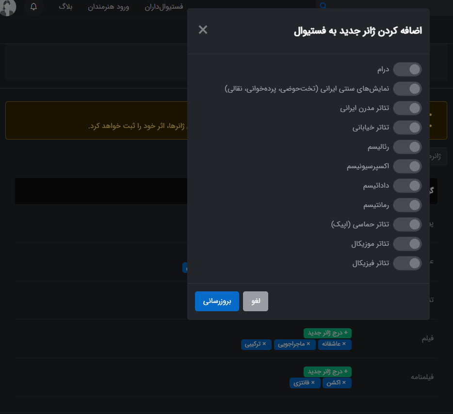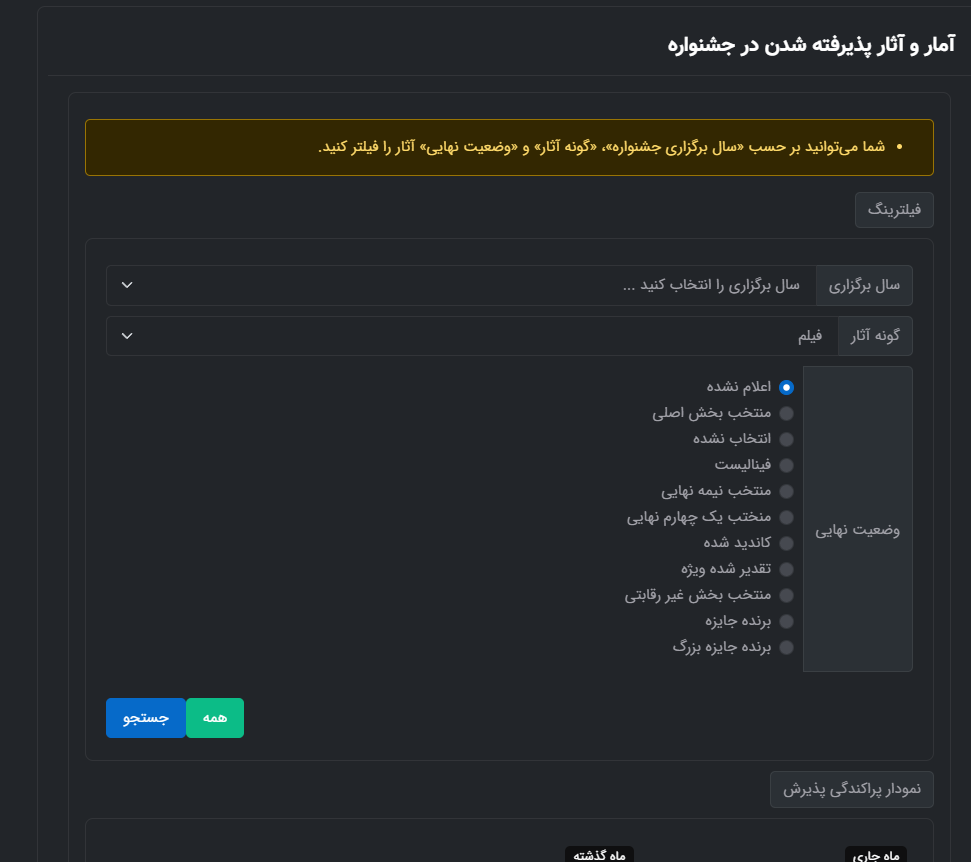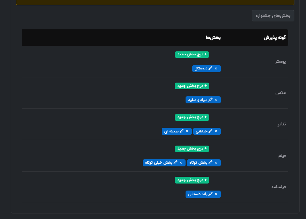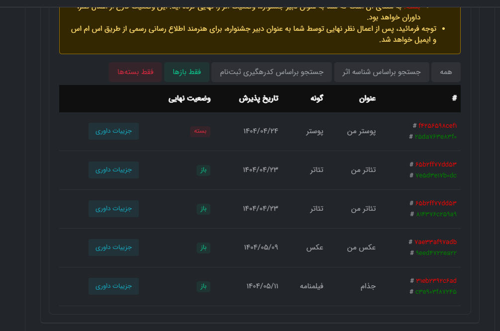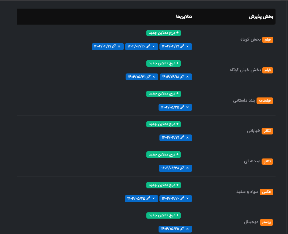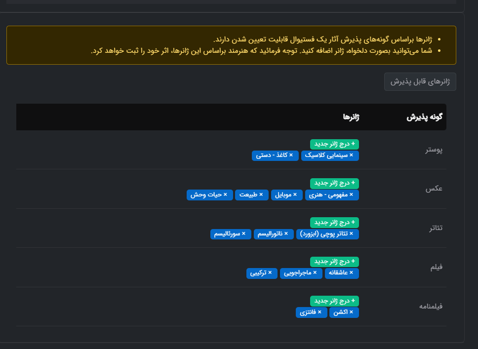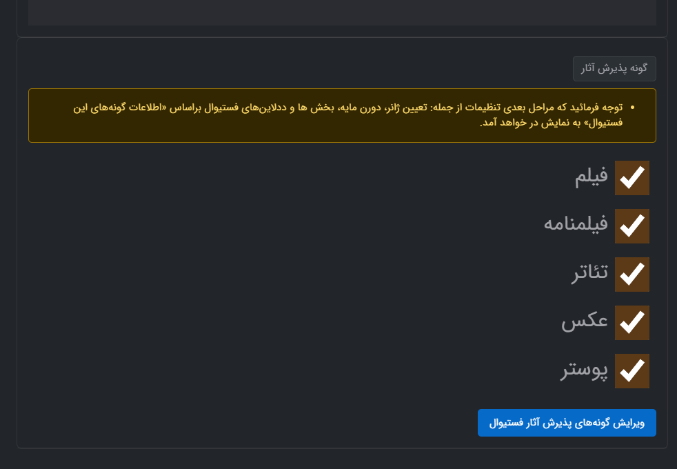با یک حساب کاربری، یک جشنواره میتواند، چندین گونه از آثار را پذیرش کند. فیلم، تئاتر، فیلمنامه، عکس و پوسترها